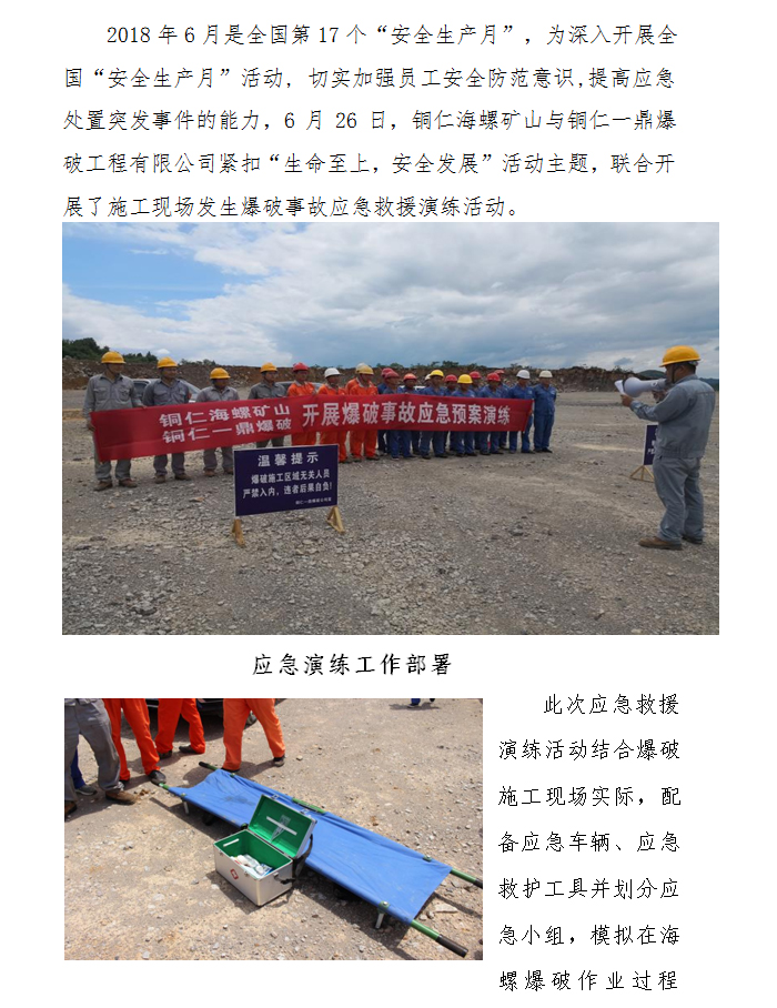 > 銅仁海螺礦山與銅仁一鼎爆破聯(lián)合開展“安全生產(chǎn)月”爆破事故 應急救援演練活動