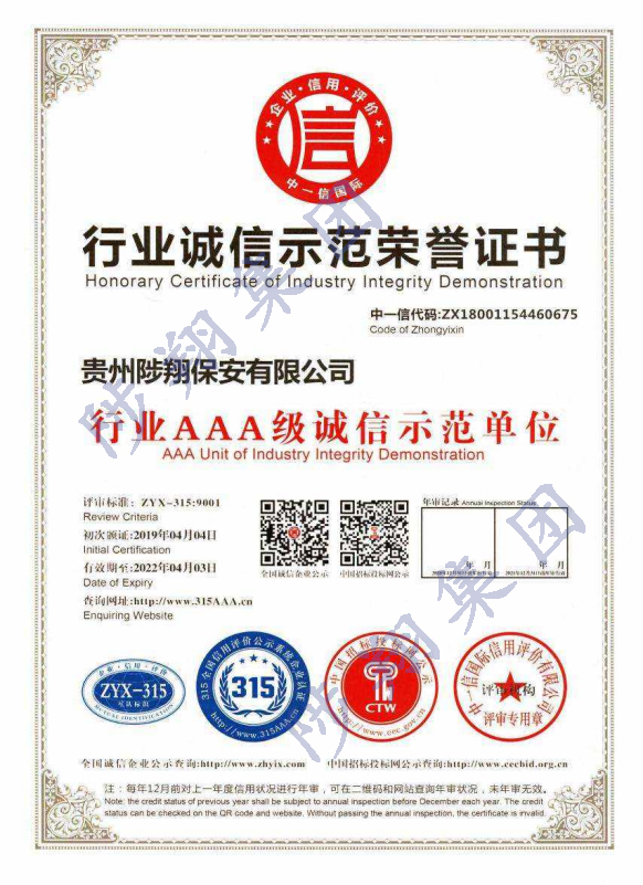 行業(yè)誠信示范榮譽(yù)證書